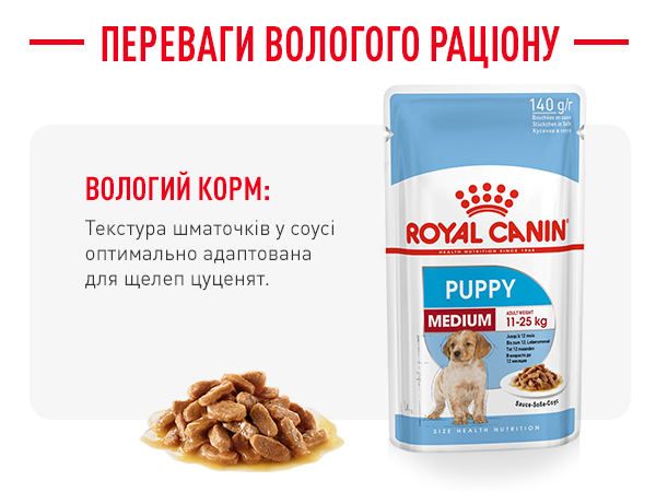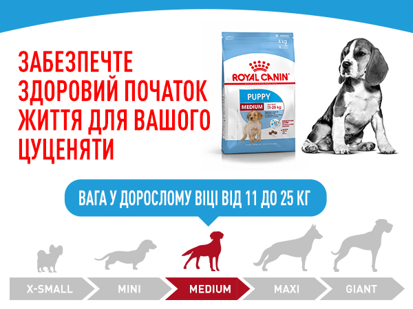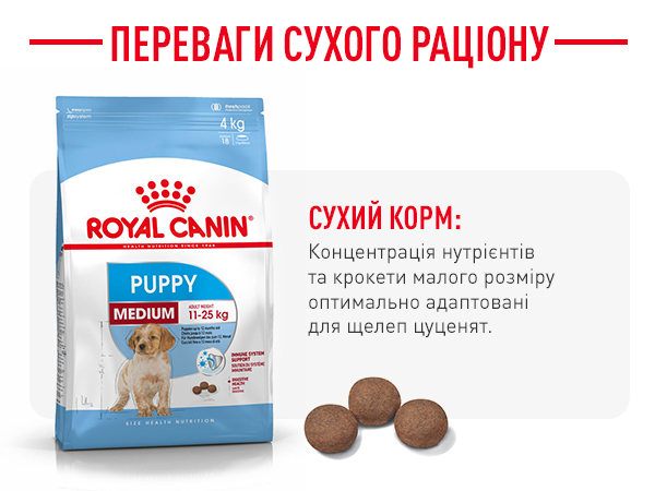Повнораціонний сухий корм для собак середніх розмірів. Вага дорослої тварини від 11 до 25 кг віком від 2 до 12 місяців.