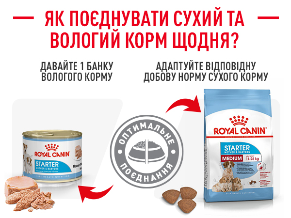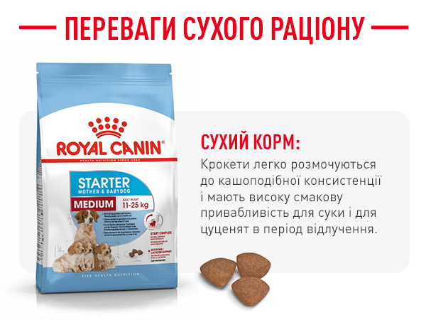 Раціон ROYAL CANIN Starter Mother & Babydog Medium розроблений для цуценят собак великих розмірів, вага яких у дорослому віці від 11 до 25 кг. Сука у період вагітності та лактації, цуценята від відлучення до 2 місяців