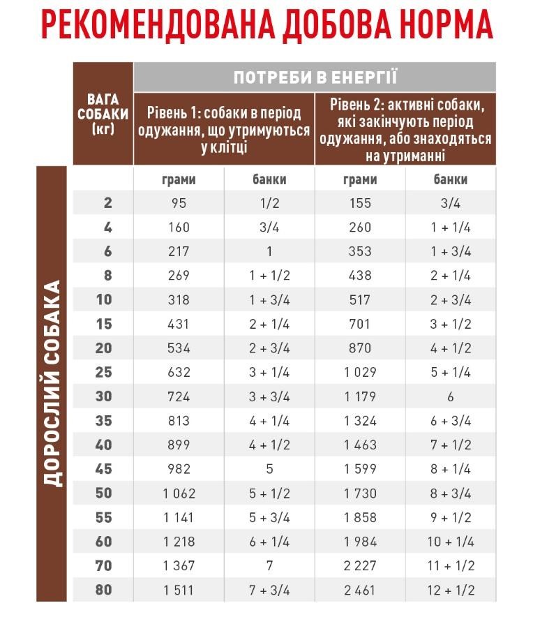 Рекомендовано забезпечувати енергетичні потреби собак у стані спокою (ЕПС) за формулою: ЕПС (ккал/день) = 70x (маса тіла у кг)*0,75 - Рівень 2: Собаки, які закінчують період одужання, або знаходяться на утриманні.