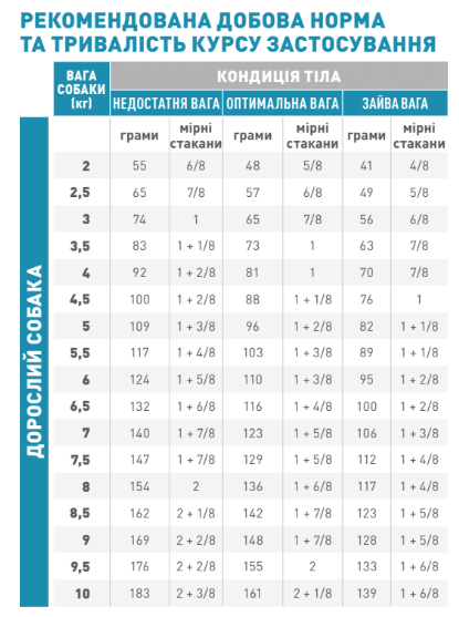 Див. таблицю. Стежте за тим, щоб у вашої тварини завжди була свіжа вода. Код партії, реєстраційний номер заводу та дата закінчення строку придатності зазначені на упаковці. Зберігати у сухому прохолодному мiсці.